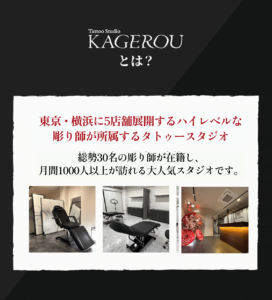 東京日本橋のKAGEROUはタトゥーの専門スタジオです。 ワンポイントデザインから全身まで対応可。レタリング・トライバル・ジオメトリック・和彫り・漫画・アニメなど幅広いジャンルで実績あり。お客様が満足できるデザインを提案しています。英語対応もしています。